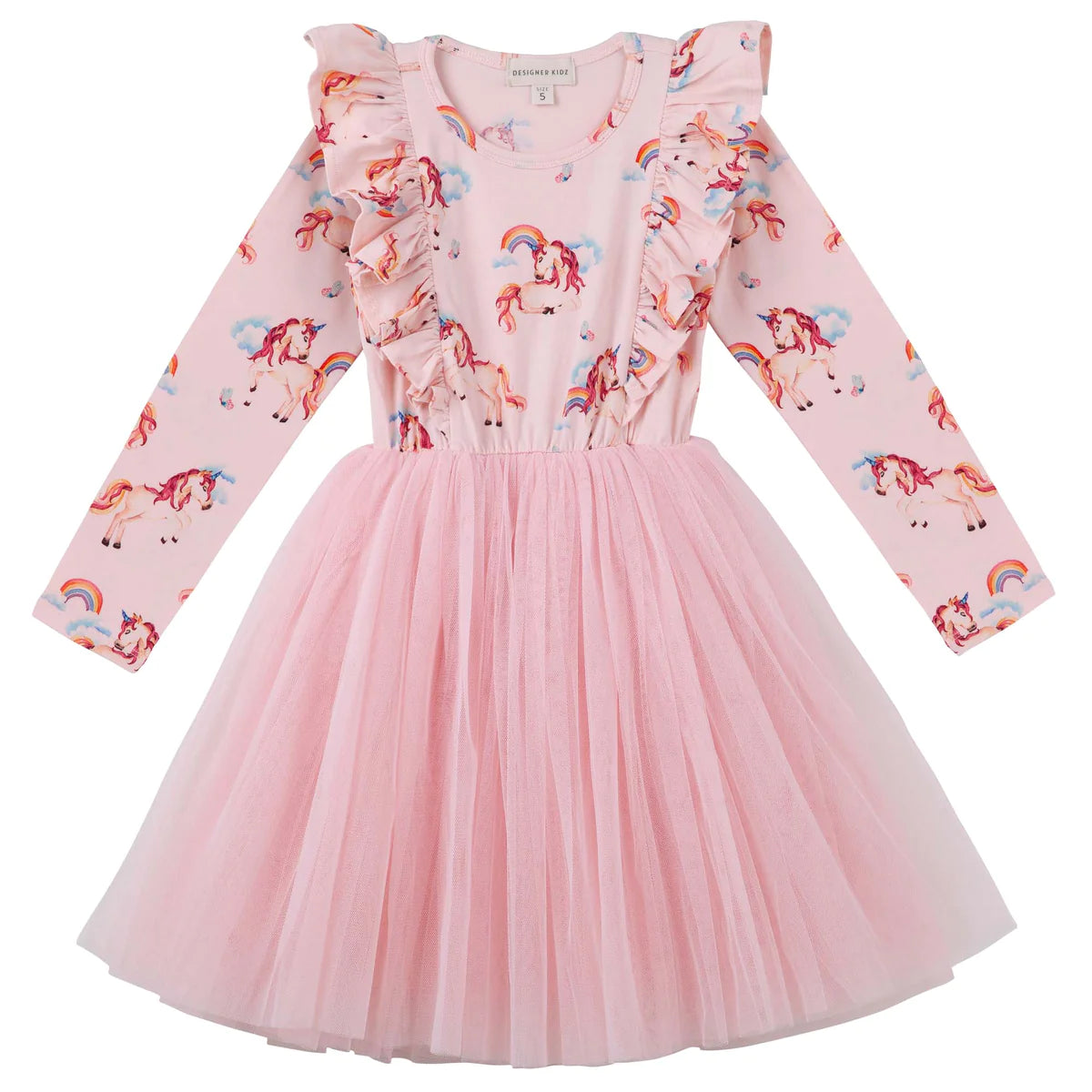 Make her big day just perfect with our Rainbow Unicorn L/S Hazel Tutu Dress, featuring our vibrant and exclusive unicorn print on soft jersey, with a bodice frill encompassing the front and back, long sleeves and a flowing tulle tutu skirt. Don't forget to pair it with our Rainbow Unicorn Headband or Rainbow Unicorn Scrunchie. Perfect for your girl's next special occasion, birthday or party celebration.